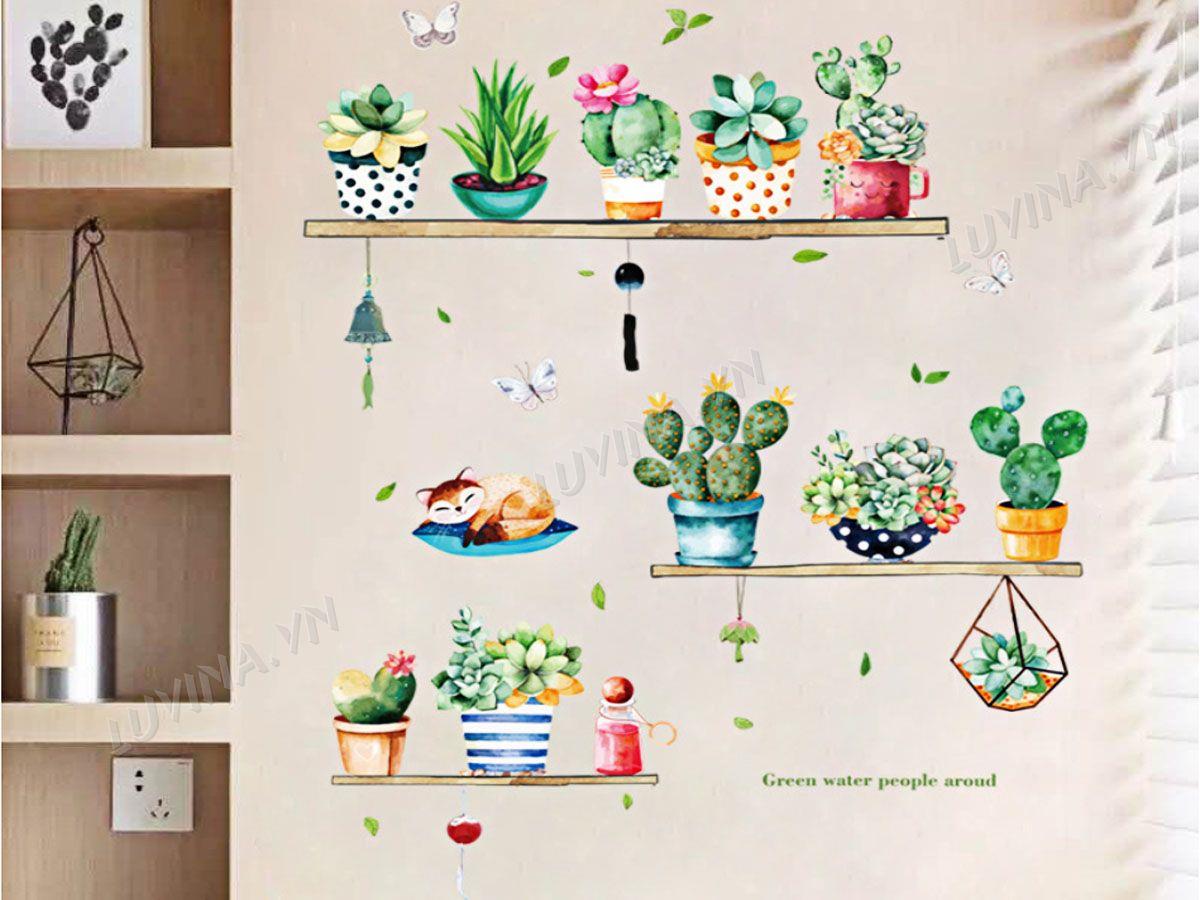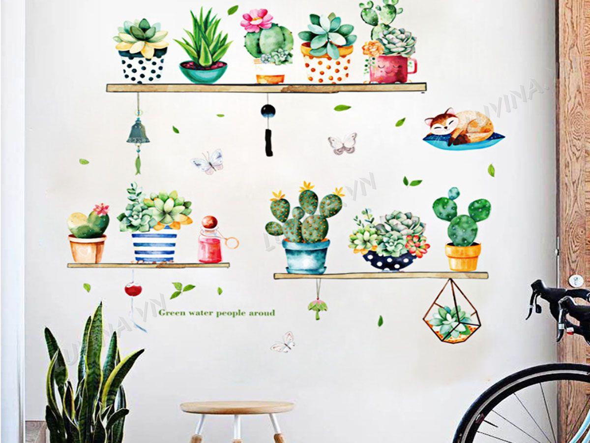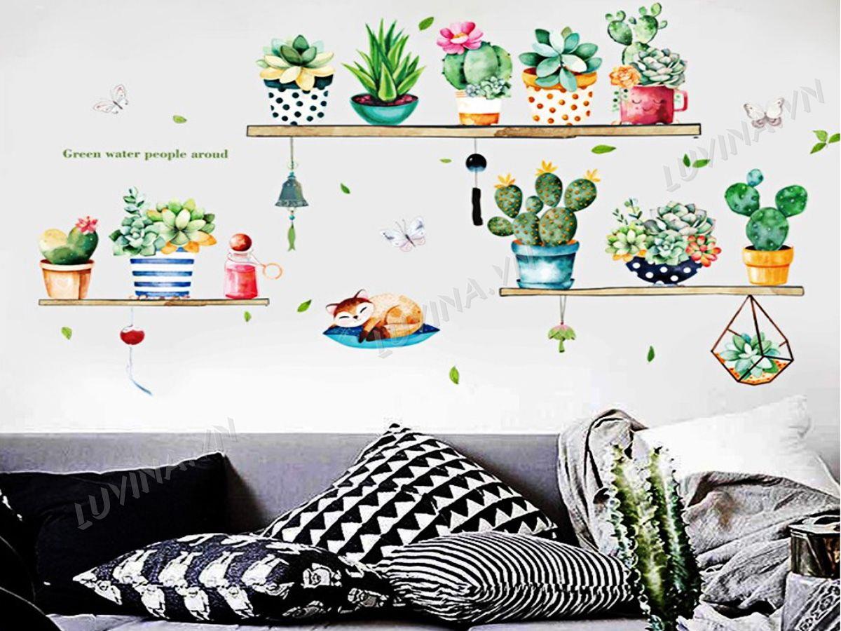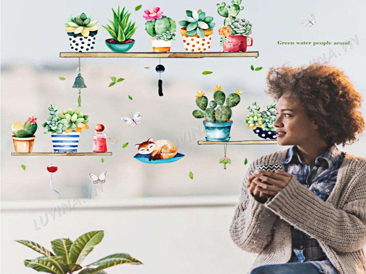 DECAL TRANG TRÍ KỆ CÂY CẢNH VÀ CON MÈO