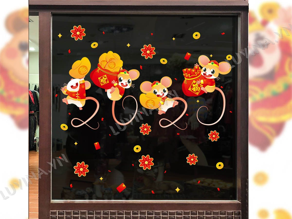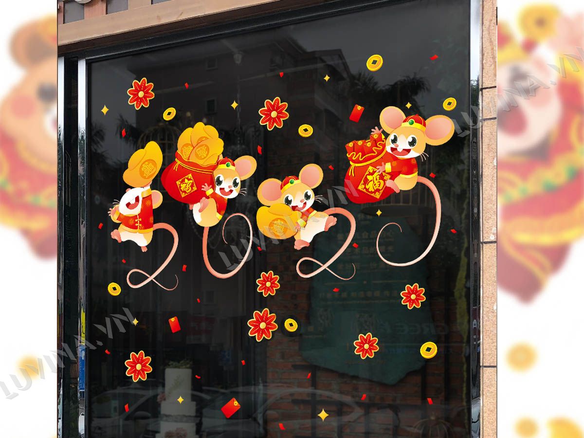 DECAL TRANG TRÍ TẾT 4 CHÚ CHUỘT ÔM ĐỒNG TIỀN