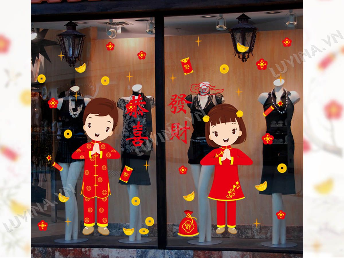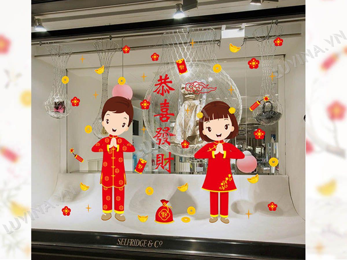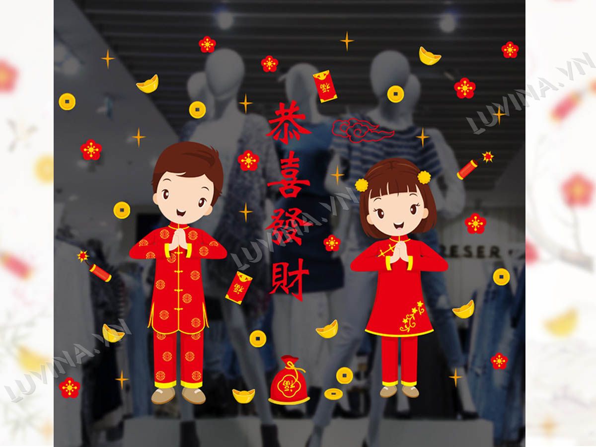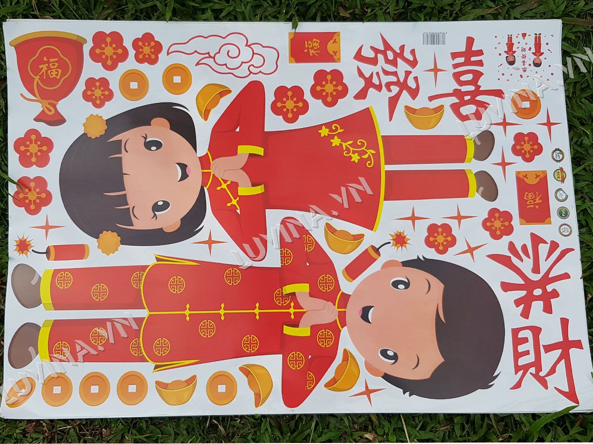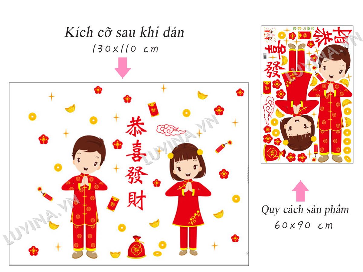 DECAL TRANG TRÍ TẾT HAI BÉ ÁO DÀI CHÚC TẾT