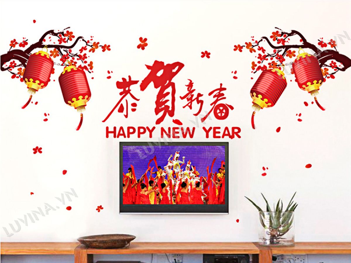 DECAL TRANG TRÍ TẾT TẾT ĐÀO PHÁO ĐỎ